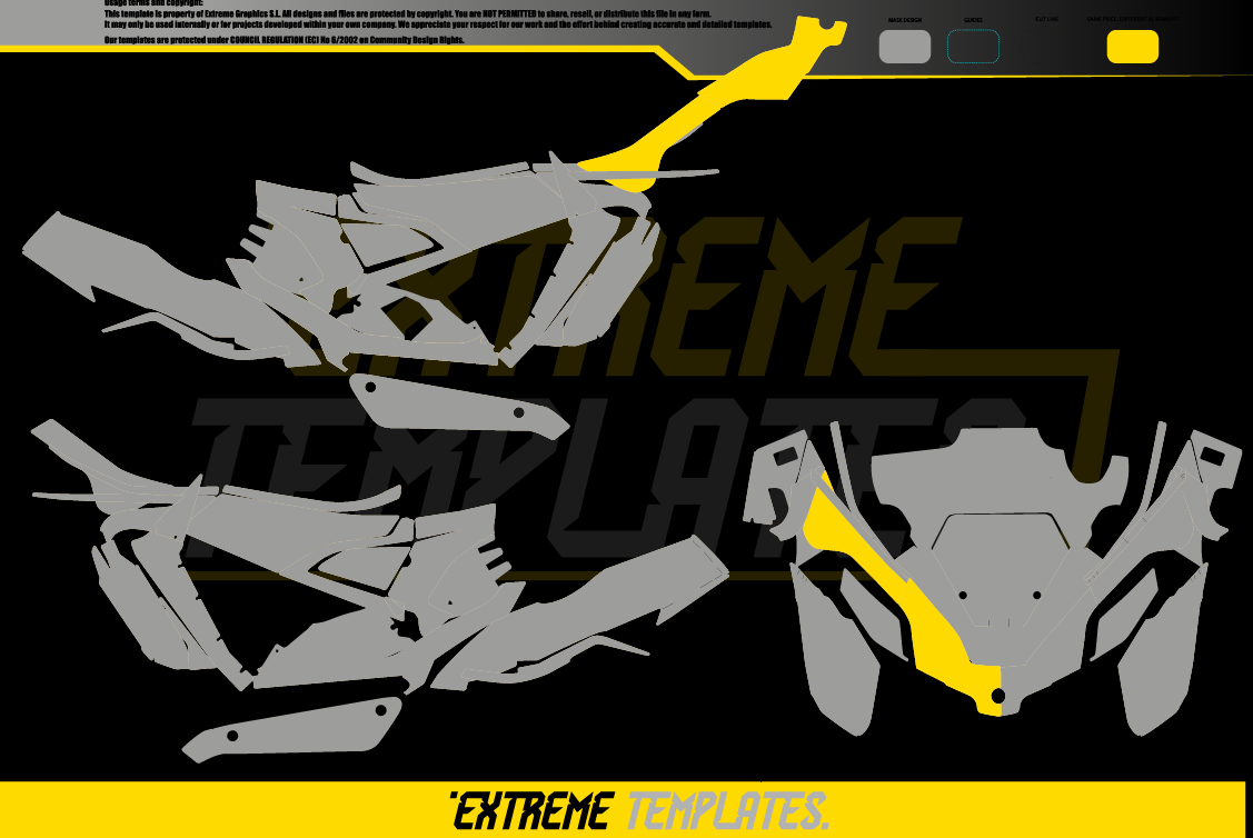Templates are supplied as editable vector files (.EPS) developed in Adobe Illustrator. They are organized in separate layers for precise cutting, alignment and design work.